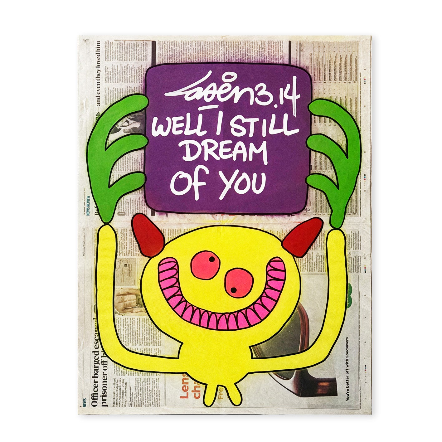 On these newspapers, Bortusk Leer painted his unmistakable, eye popping characters holding signs, while Laser 3.14 added his signature handstyle/tag in paint on the signs transforming disposable objects of commercial culture into raw, vivid works of art.