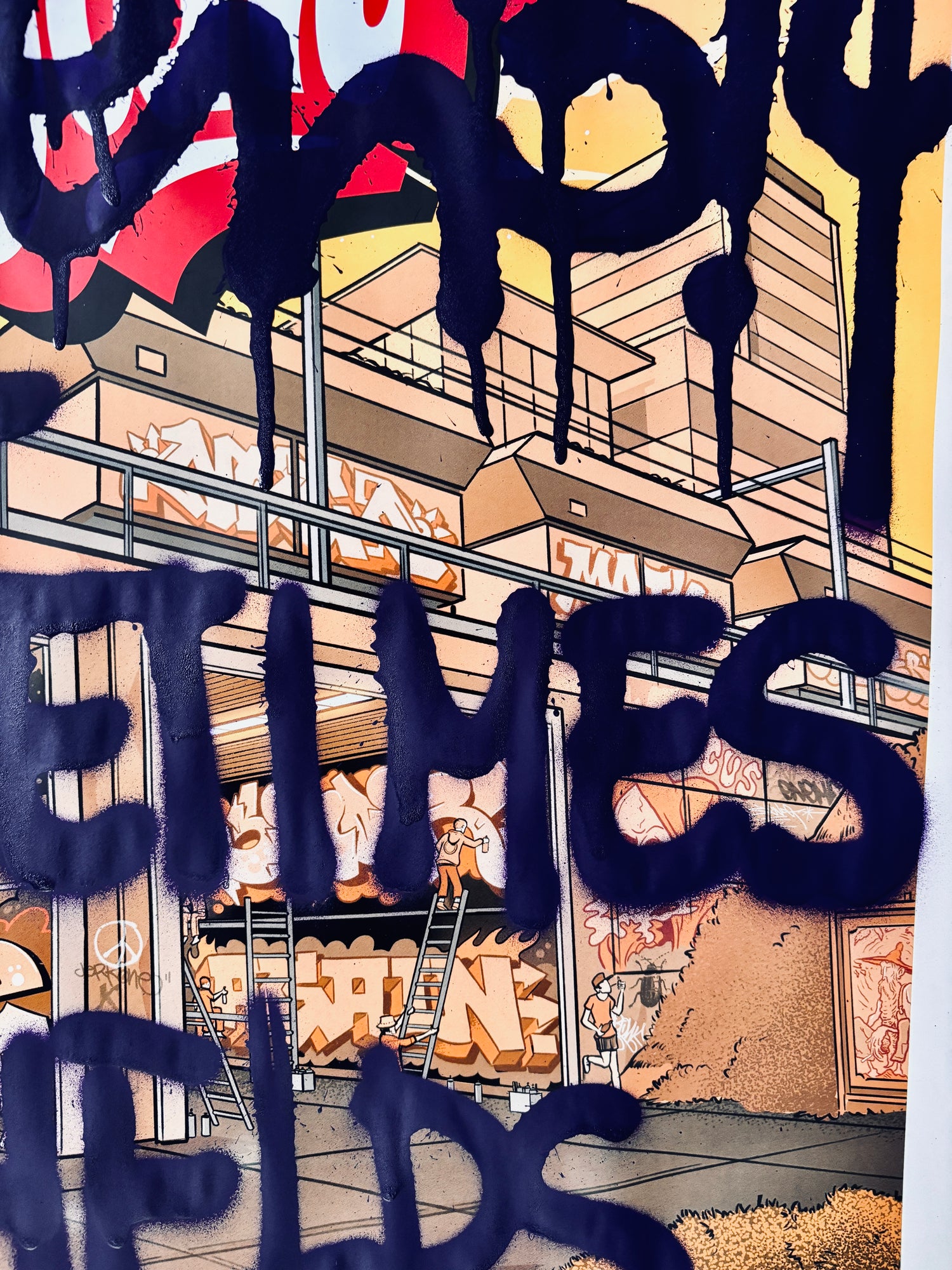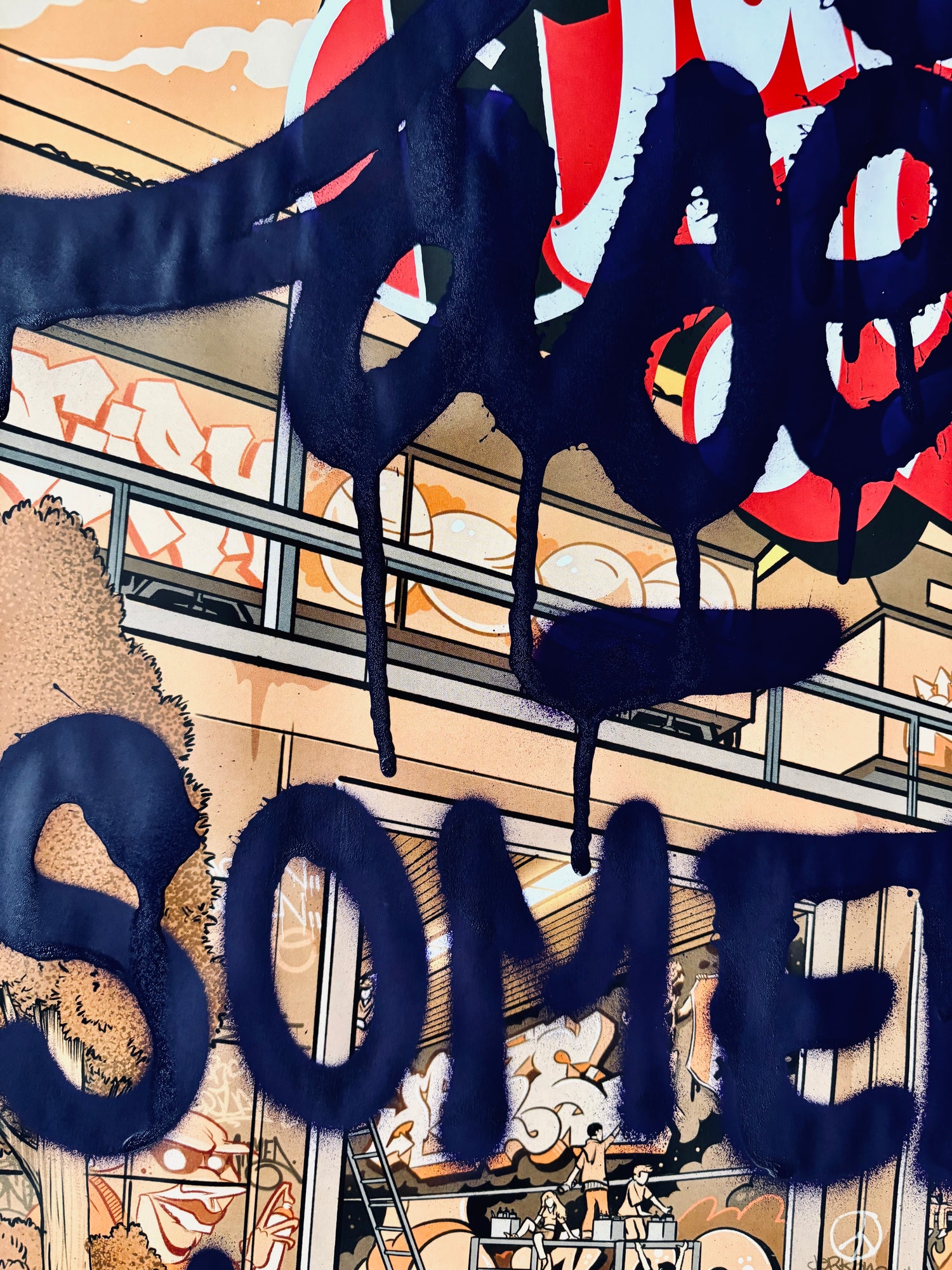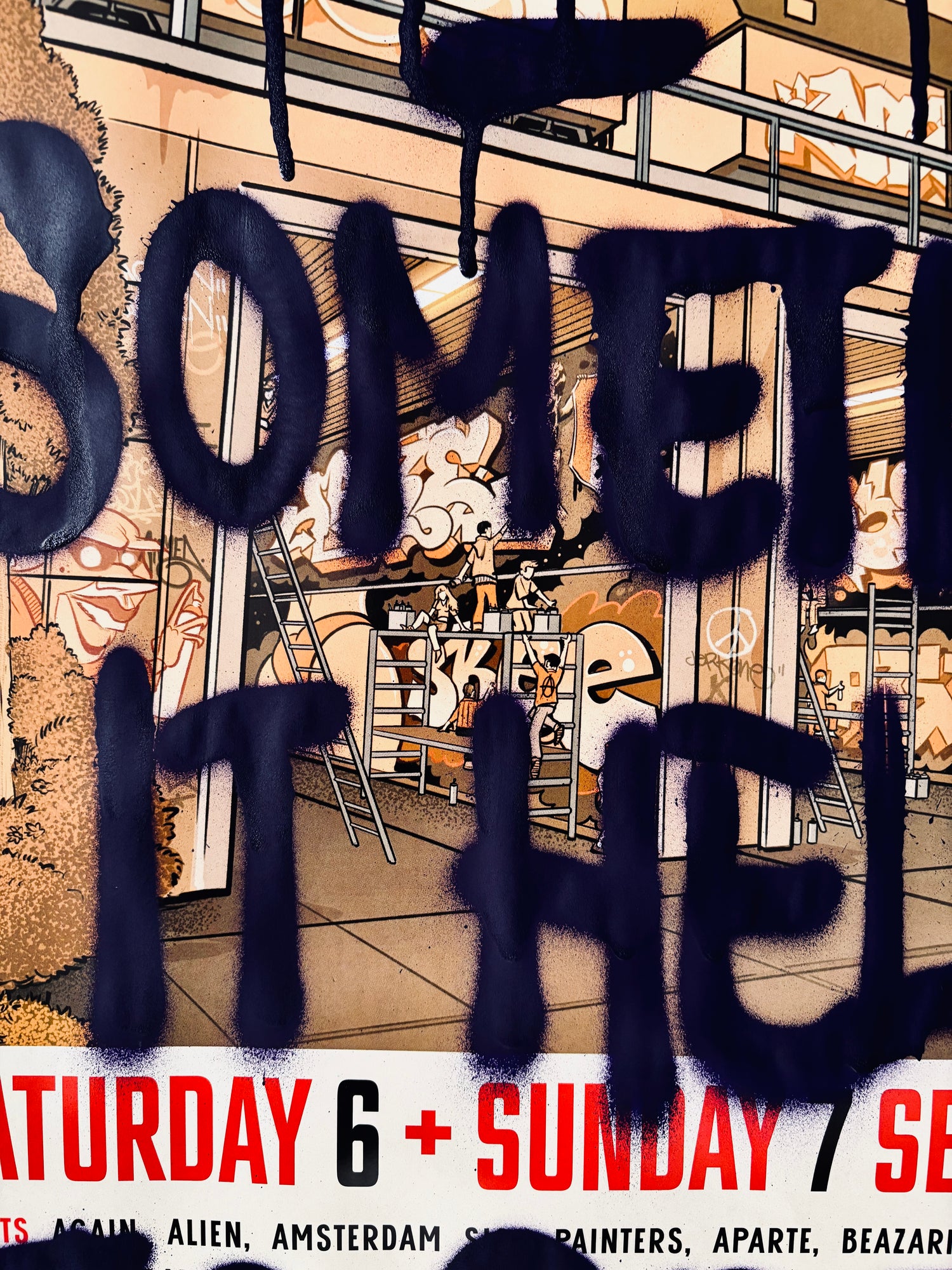 On top of these posters, Laser 3.14 has added his signature handstyle/tag in paint, transforming a disposable object of commercial culture into a raw artwork.